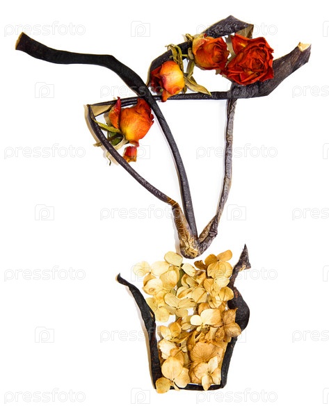 Ваза с цветами, букет из сушеных роз, баклажан и чистотела