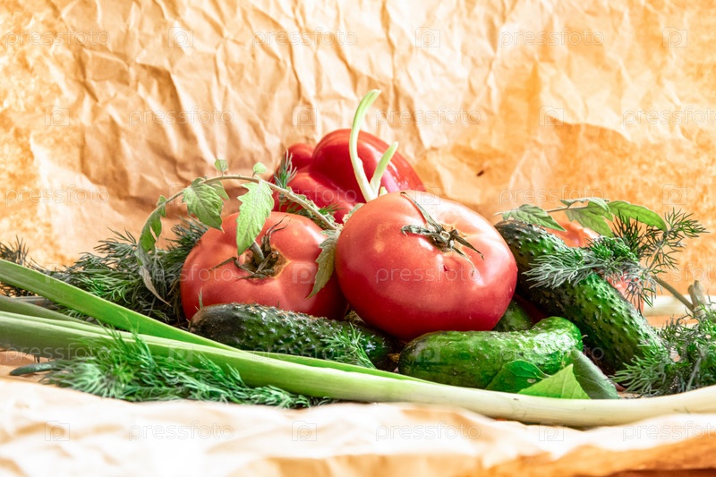 Расположение на оберточной бумаге ассортимента свежих овощей, красного перца, чеснока, зеленого лука, помидоров, огурцов