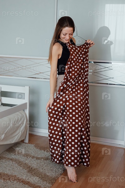 Красивая привлекательная дама из Азии выбирает одежду на вешалке, одевая себя в зеркало в гостиной дома. Девушка думает, что надеть повседневную рубашку. Женщины образа жизни отдыхают дома