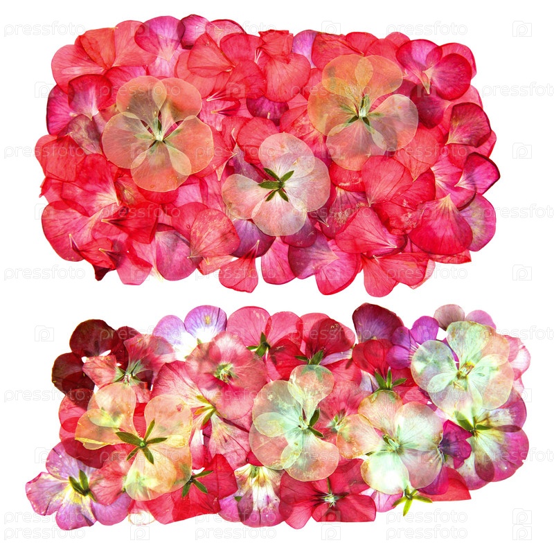 Прессованная многоцветная герань задает перспективу. Сухие нежные изолированные цветы и лепестки пеларгонии