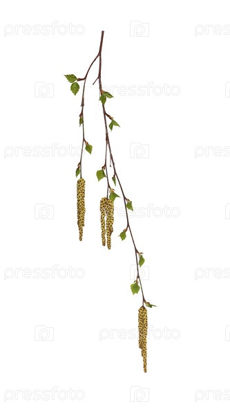 Березовая ветка с цветущими сережками, цветущая ветвь сережек ивы крупным планом ранней весной, отдельные элементы на белом фоне для альбома для вырезок, объект