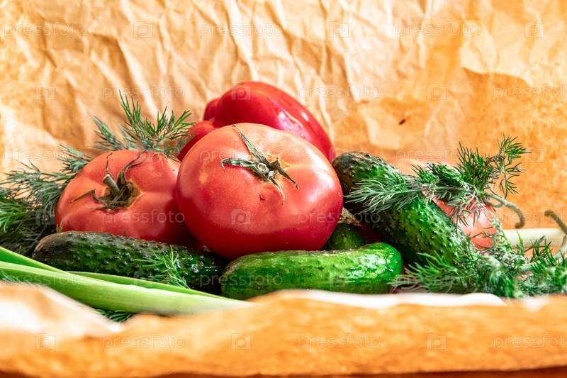 Расположение на оберточной бумаге ассортимента свежих овощей, красного перца, чеснока, зеленого лука, помидоров, огурцов