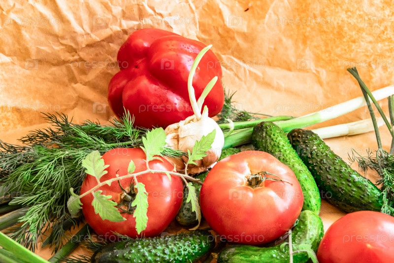 Расположение на оберточной бумаге ассортимента свежих овощей, красного перца, чеснока, зеленого лука, помидоров, огурцов