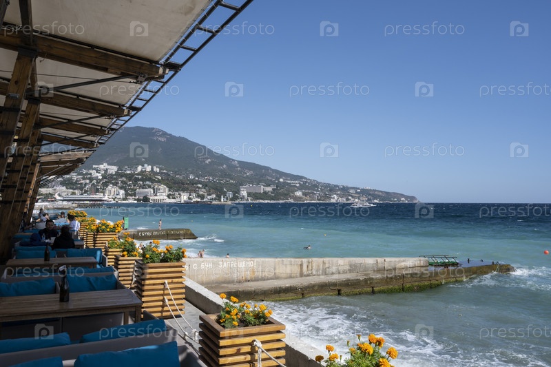 Кафе на набережной города Ялта в Республике Крым, Россия. Ясный солнечный день 21 сентября 2020 г