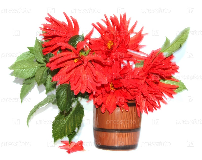 Красные георгины в керамической вазе, изолированные в движении