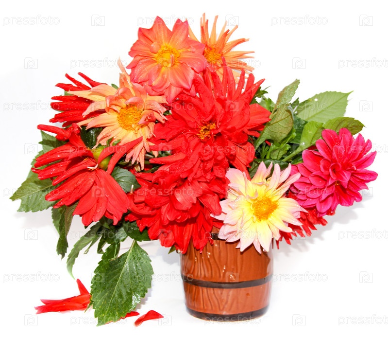 Красочные желтые, красные игольчатые цветы георгина с каплями воды в керамической кружке, разбросанные лепестки, изолированные на белом