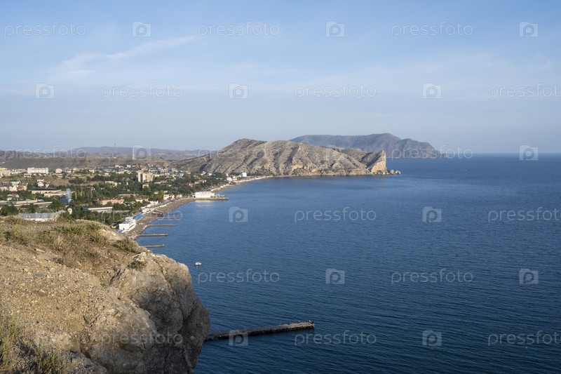 Панорамный вид на Судак, Республика Крым, Россия. Вечером 4 октября 2020 г