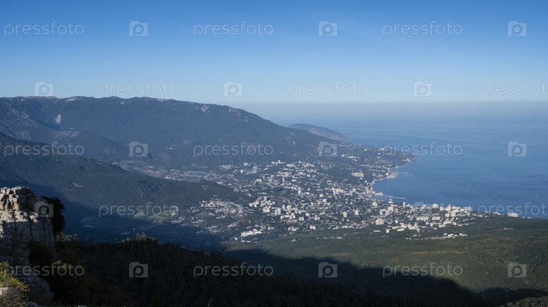 Вид на город Ялту, горы и море. Республика Крым, Россия. Вечером 20 сентября 2020 г