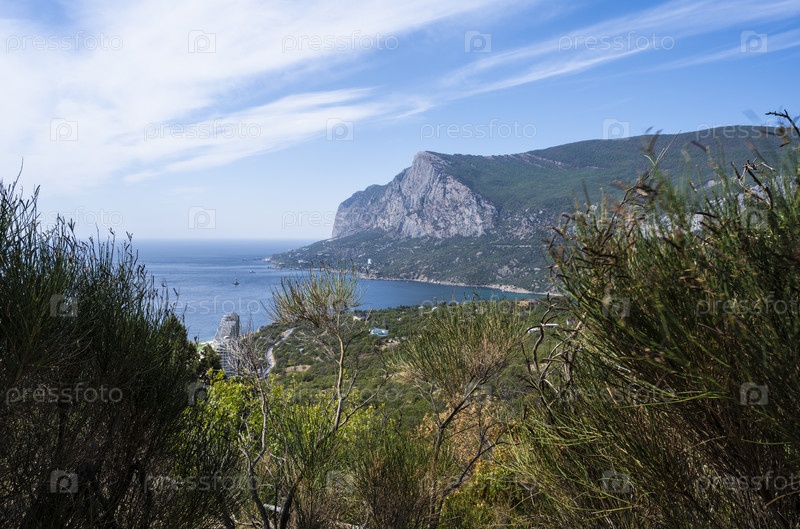 Вид на гору Куш-Кая и море в Республике Крым, Россия. Пасмурный день 18 сентября 2020 г
