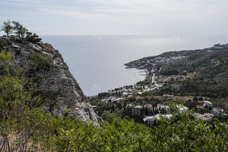 Вид на село Кацивели и море в Республике Крым, Россия. Пасмурный день 18 сентября 2020 г