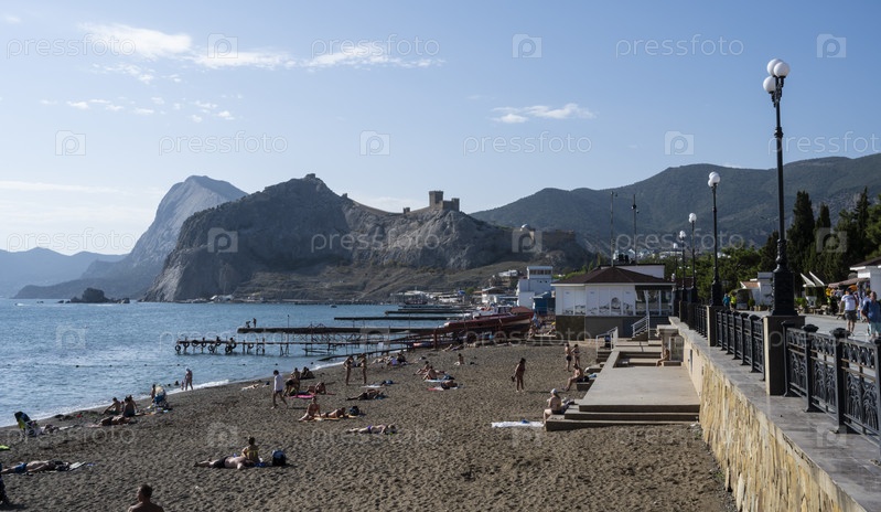 Пляж в Судаке, Республика Крым, Россия. Ясный солнечный день 5 октября 2020 г