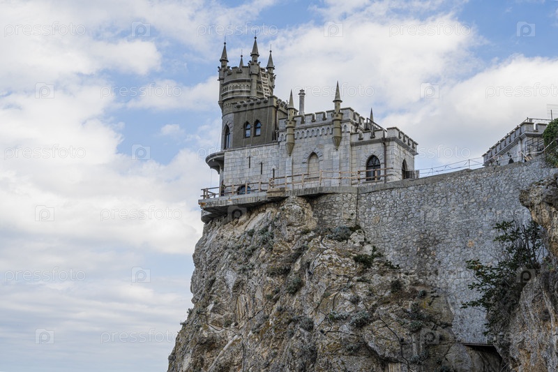 Замок Ласточкино гнездо на крутой скале является туристической достопримечательностью в Республике Крым, Россия. Пасмурный день 9 сентября 2020 г
