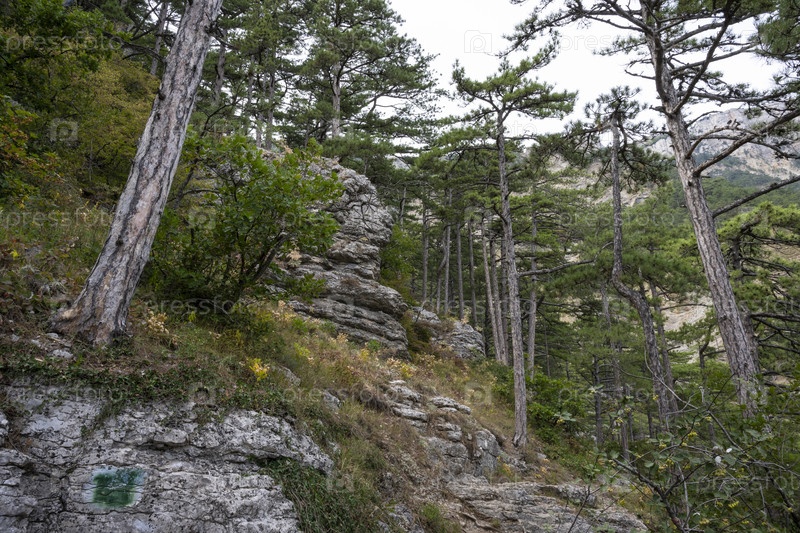 Деревья и скалы на горе Ставри-Кая в Республике Крым, Россия. Пасмурный день 13 сентября 2020 г