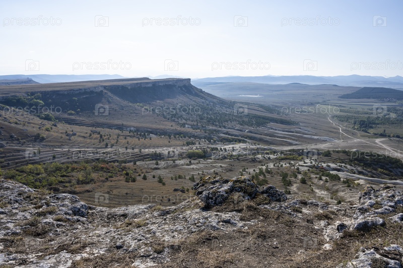 Вид на горы и поля с Белой скалы в Республике Крым, Россия. Ясное, солнечное утро 2 октября 2020 г