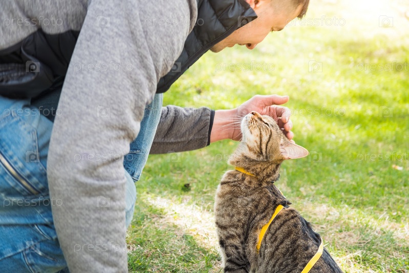 Прогулка домашней кошки с хозяином на желтой шлейке. Полосатый кот, лаская руку человека на улице, прячется в зеленой траве, осторожно и с любопытством. Учим питомца ходить