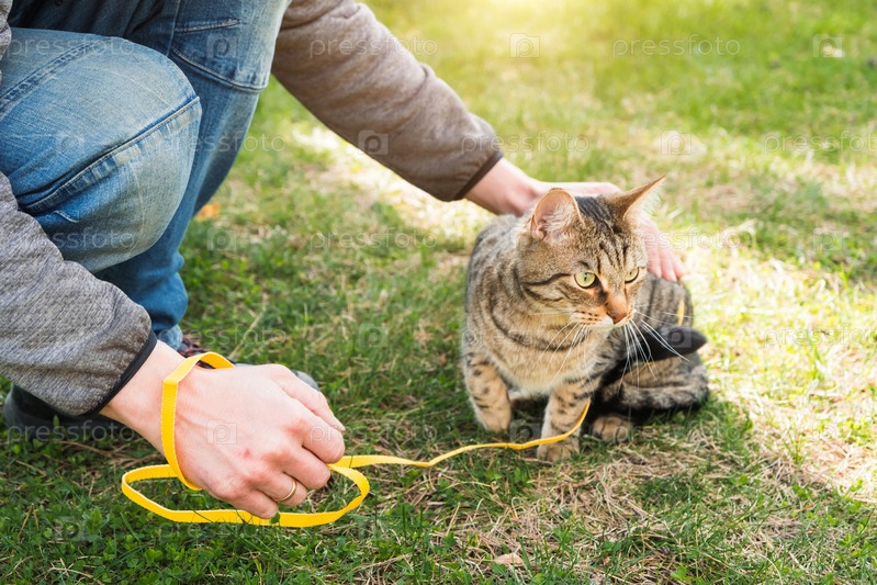 Прогулка домашней кошки с хозяином на желтой шлейке. Полосатый кот, лаская руку человека на улице, прячется в зеленой траве, осторожно и с любопытством. Учим питомца ходить