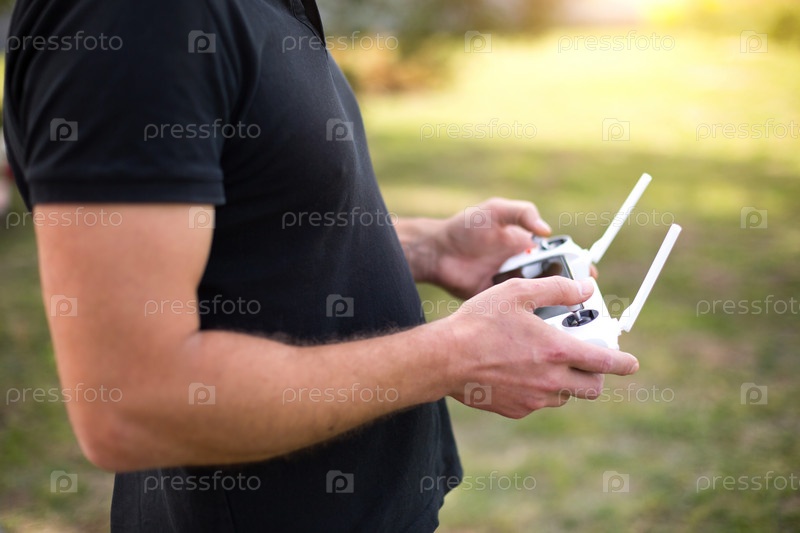 Управление квадрокоптером с джойстика с наружными антеннами. Съемка видео сверху в полете с коптера, техника на экране смартфона