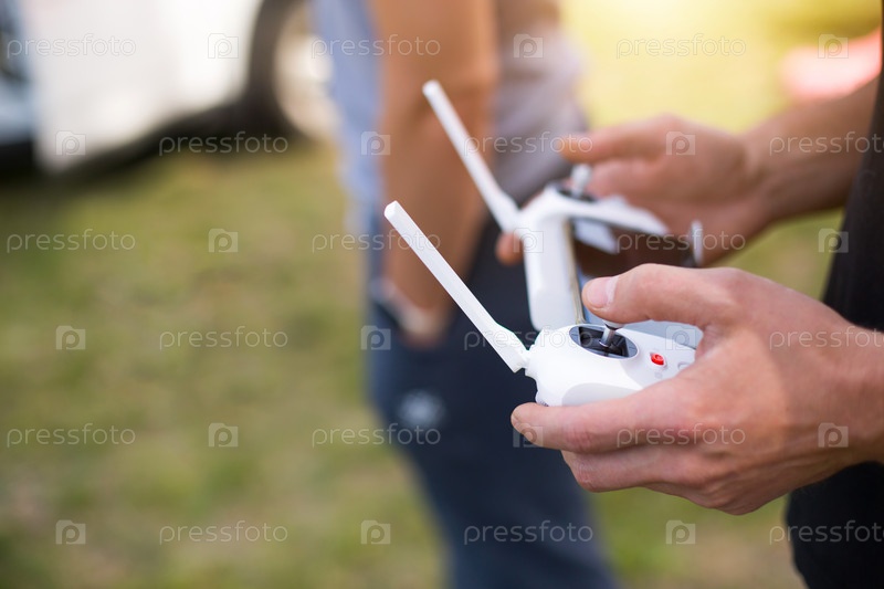 Управление квадрокоптером с джойстика с наружными антеннами. Съемка видео сверху в полете с коптера, техника на экране смартфона