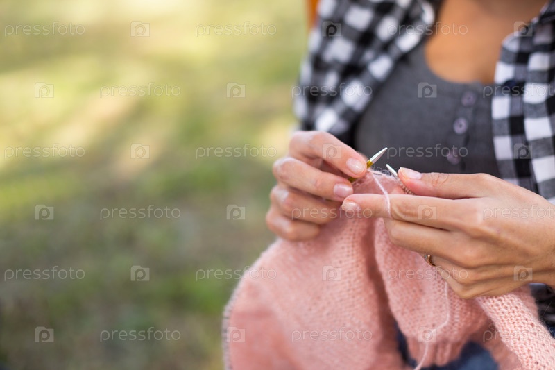 Женские руки вяжут шерстяную ткань из клубка розовых ниток. Одежда своими руками, рукоделие