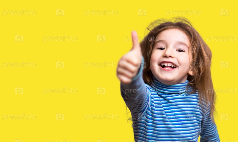 Маленькая девочка кавказской внешности в синей полосатой водолазке показывает большой палец вверх и смеется, счастливо улыбаясь. Желтый фон, пространство для копирования
