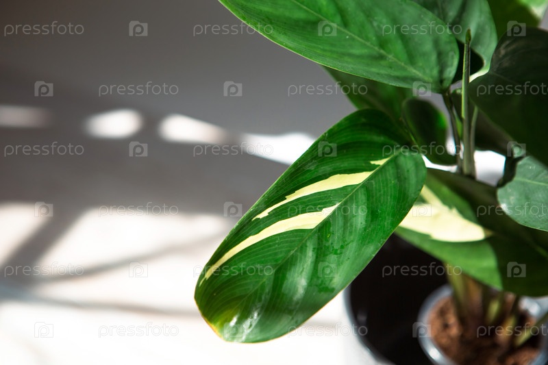 Сорт Ctenanthe marantifolia Golden Mosaic - крупный план листьев на подоконнике при ярком солнечном свете с тенями. комнатные растения в горшках, зеленый домашний декор, уход и выращивание