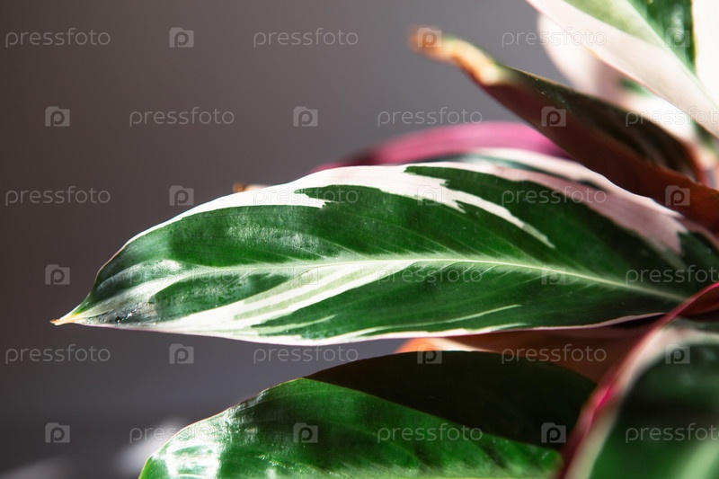 Кроваво-красная строманта - лист крупного плана сорта Stromanthe Triostar Tricolor на подоконнике при ярком солнечном свете с тенями. комнатные растения в горшках, зеленый домашний декор, уход и выращивание