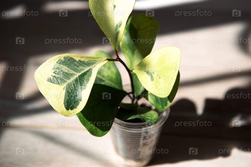 Сорт кокосового крема, Ficus triangularis в стакане для трансплантации крупным планом листа на подоконнике при ярком солнечном свете с тенями. комнатные растения в горшках, зеленый домашний декор, уход и выращивание. фикус