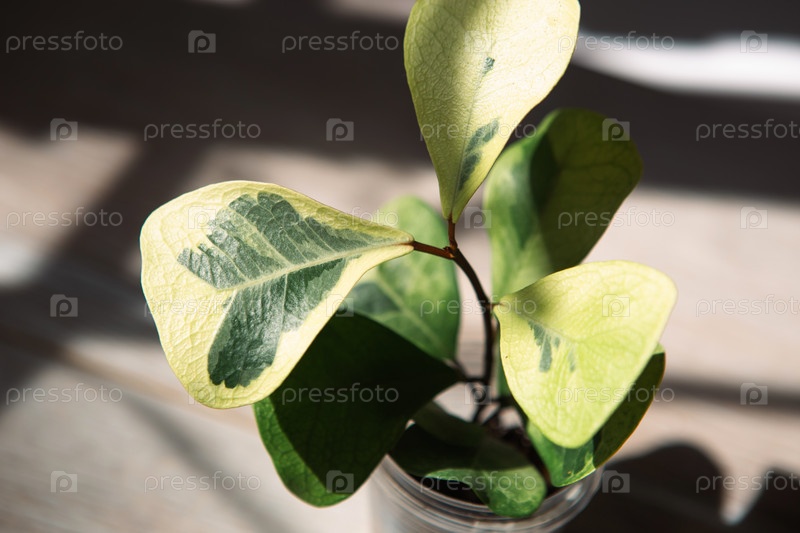 Сорт кокосового крема, Ficus triangularis в стакане для трансплантации крупным планом листа на подоконнике при ярком солнечном свете с тенями. комнатные растения в горшках, зеленый домашний декор, уход и выращивание. фикус