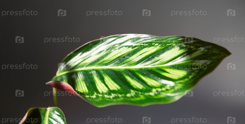 Calathea Flamestar зеленый образец листьев в крупном плане на подоконнике при ярком солнечном свете с тенями. комнатные растения в горшках, зелёный домашний декор, уход и выращивание, сорты марантовые. копировать пространство
