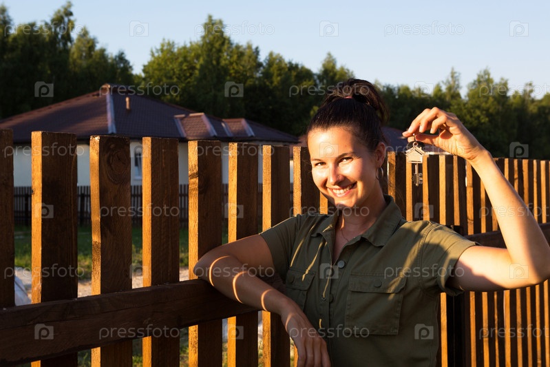 Счастливая женщина с ключами от дома в руке возле деревянного забора своего дома в коттеджном поселке. Владелец недвижимости, агент, риелтор. Переезд, покупка жилья. Ипотека и аренда. Копировать пространство