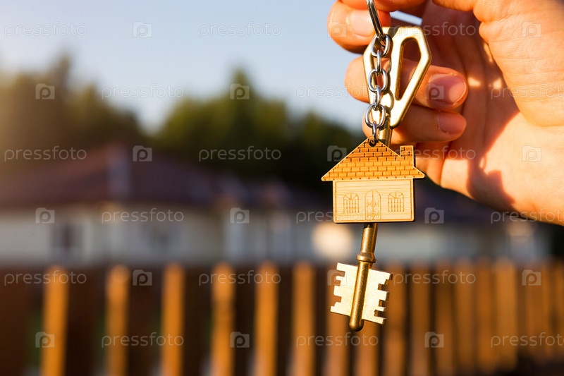 Брелок для ключей с домом для ключей в руке. Фон забора и коттеджа. Переезд в новый дом, ипотека, покупка недвижимости, аренда и бронирование жилья, мечта о жизни в деревне. Копировать пространство