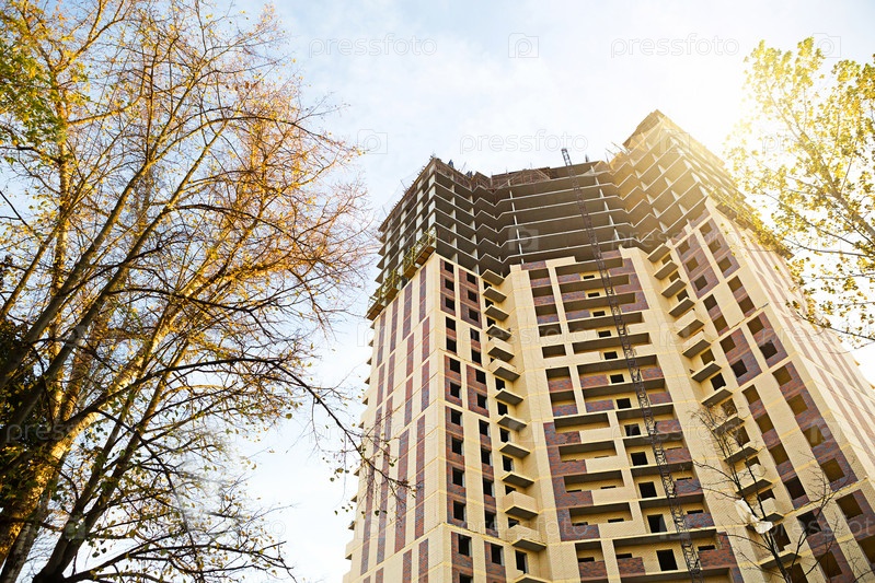 Строительство многоэтажного жилого дома в г. Кран возле небоскреба. Строительство, переезд в новую квартиру, ипотека, аренда и покупка недвижимости. Копировать пространство