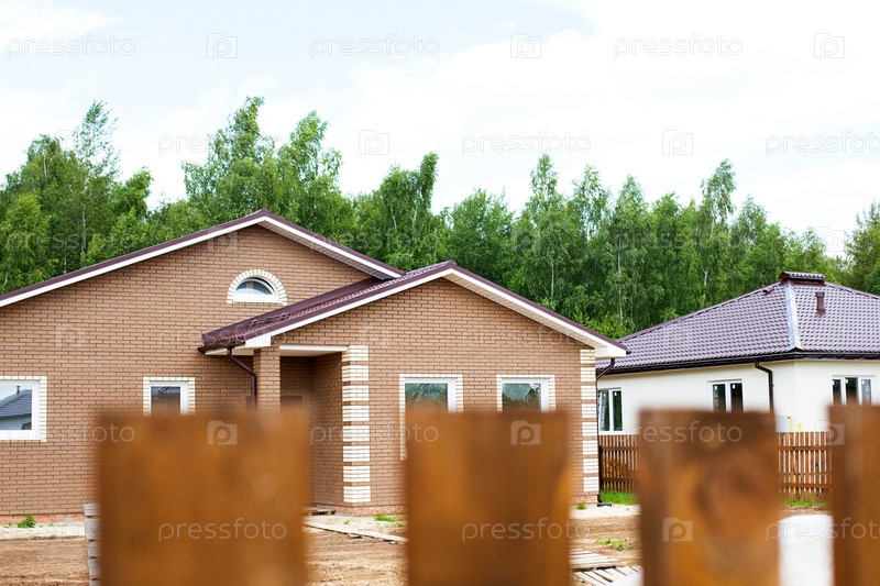 Деревянный забор на фоне коттеджа. Вид из окна дома в деревне. Переезд в деревню, строительство, ипотека, аренда и покупка недвижимости. Коттеджкор. Копировать пространство