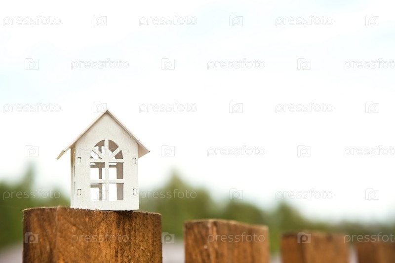 Маленькая фигурка белого деревянного дома на заборе с ключом от жилья на фоне коттеджей. Строительство, дизайн, проект, переезд в новый дом, ипотека, аренда и покупка недвижимости. Копировать пространство