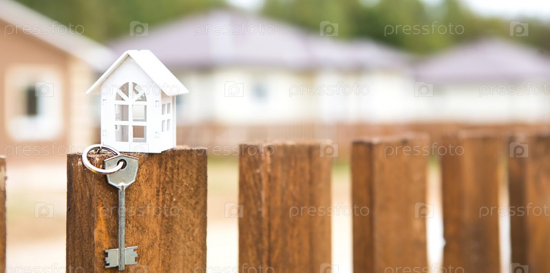 Маленькая фигурка белого деревянного дома на заборе с ключом от жилья на фоне коттеджей. Строительство, дизайн, проект, переезд в новый дом, ипотека, аренда и покупка недвижимости. Копировать пространство