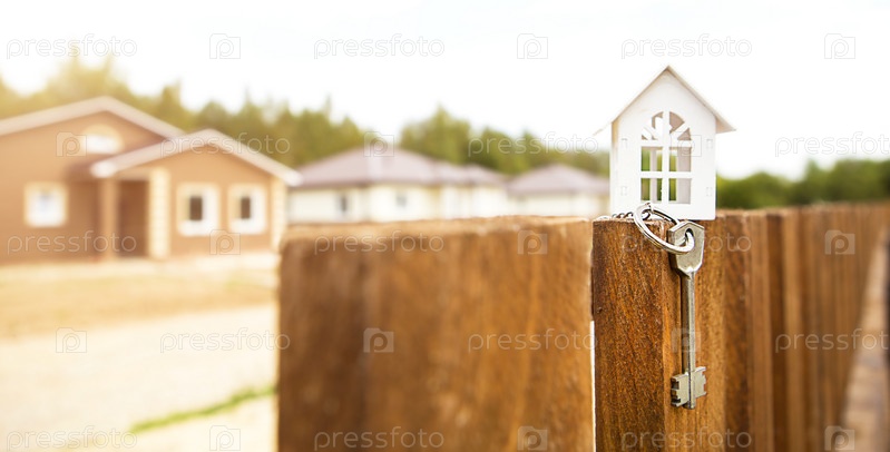 Маленькая фигурка белого деревянного дома на заборе с ключом от жилья на фоне коттеджей. Строительство, дизайн, проект, переезд в новый дом, ипотека, аренда и покупка недвижимости. Копировать пространство