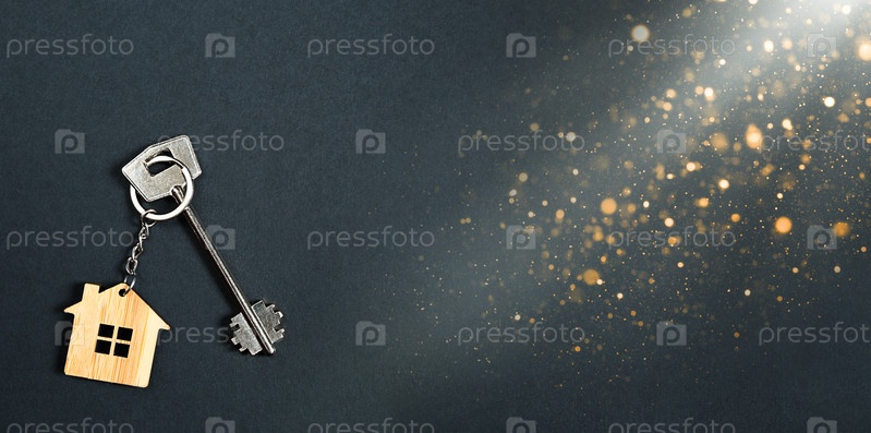 Брелок в виде деревянного дома с ключом на черном фоне. Строительство, дизайн, проект, переезд в новый дом, ипотека, аренда и покупка недвижимости. Копировать пространство