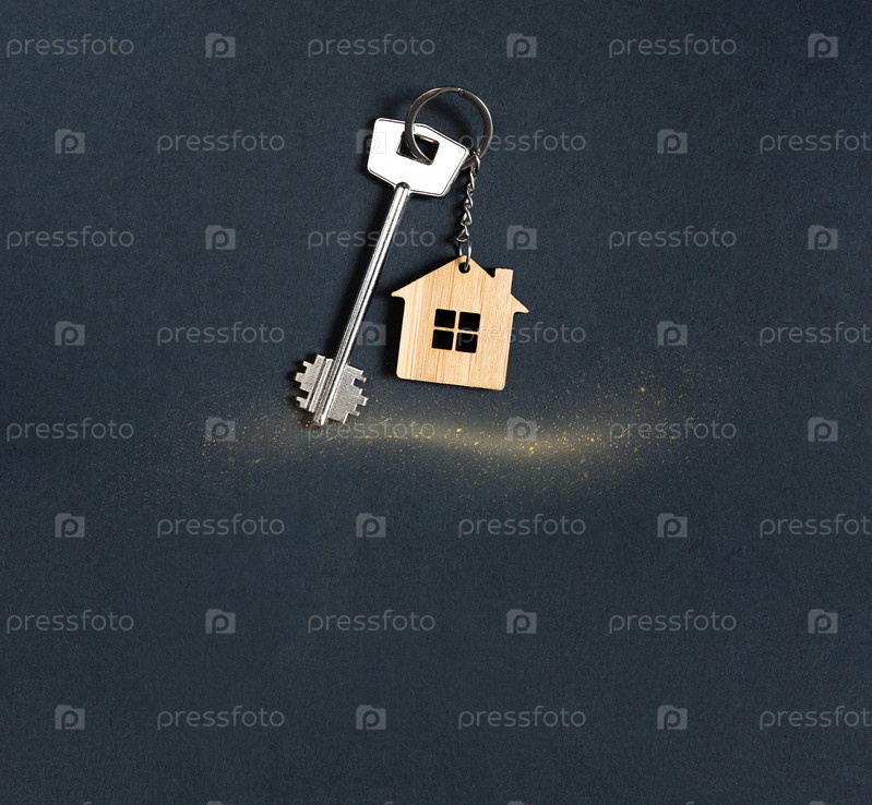 Брелок в виде деревянного дома с ключом на черном фоне. Строительство, дизайн, проект, переезд в новый дом, ипотека, аренда и покупка недвижимости. Копировать пространство