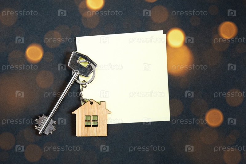 Брелок в виде деревянного дома с ключом на черном фоне с квадратным листом для заметок. Строительство, дизайн, проект, переезд в новый дом, ипотека, аренда и покупка недвижимости. Копировать пространство