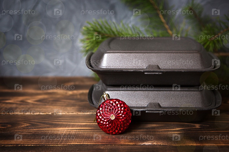 Рождественский декор контейнеров службы доставки еды и коробки для пиццы. Предновогодняя акция. Готовый горячий заказ, одноразовая пластиковая и бумажная упаковка. Работа по организации питания в праздничные дни. Копипространство