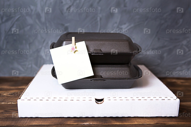 Рождественский декор контейнеров службы доставки еды и коробки для пиццы. Предновогодняя акция. Готовый горячий заказ, одноразовая пластиковая и бумажная упаковка. Работа по организации питания в праздничные дни. Копипространство
