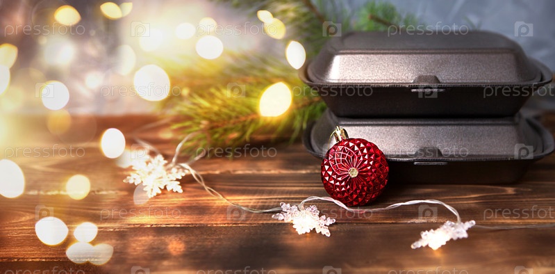 Рождественский декор контейнеров службы доставки еды и коробки для пиццы. Предновогодняя акция. Готовый горячий заказ, одноразовая пластиковая и бумажная упаковка. Работа по организации питания в праздничные дни. Копипространство
