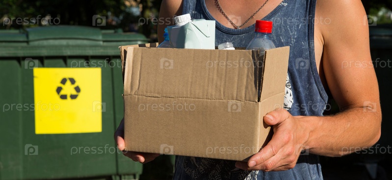 Картонная коробка с мусором в руках мужчины возле контейнеров для раздельного сбора отходов. Экологическое сознание населения, забота об окружающей среде, разделение: пластик, картон, упаковка