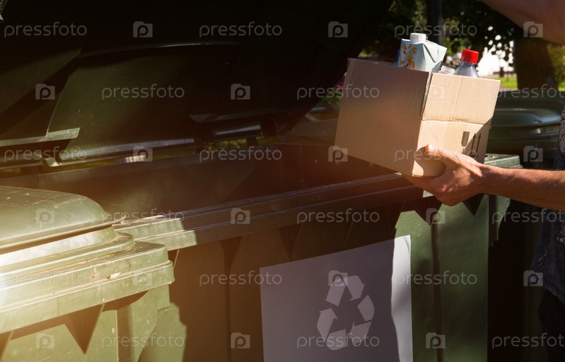 Картонная коробка с мусором в руках мужчины возле контейнеров для раздельного сбора отходов. Экологическое сознание населения, забота об окружающей среде, разделение: пластик, картон, упаковка