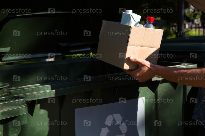 Картонная коробка с мусором в руках мужчины возле контейнеров для раздельного сбора отходов. Экологическое сознание населения, забота об окружающей среде, разделение: пластик, картон, упаковка