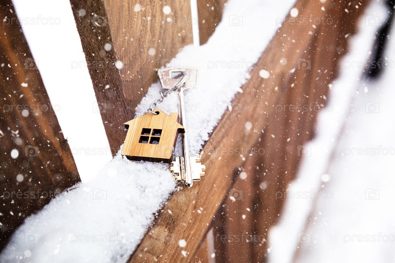 Ключ от дома на деревянном заборе зимой в снегу. Подарок на Новый год, Рождество. Строительство, дизайн, проект, переезд в новый дом, ипотека, аренда и покупка недвижимости. Копировать пространство
