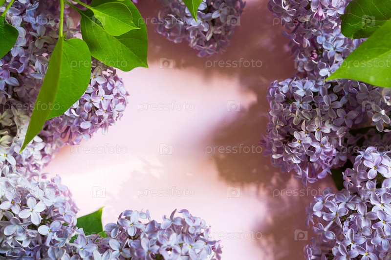 Фиолетовые ветки сирени с тенями и бликами на розовом весеннем фоне. Рамка с копирайтом с нежными ароматными цветами - начало лета. Праздник 8 марта, Пасха, день рождения, поздравительная открытка