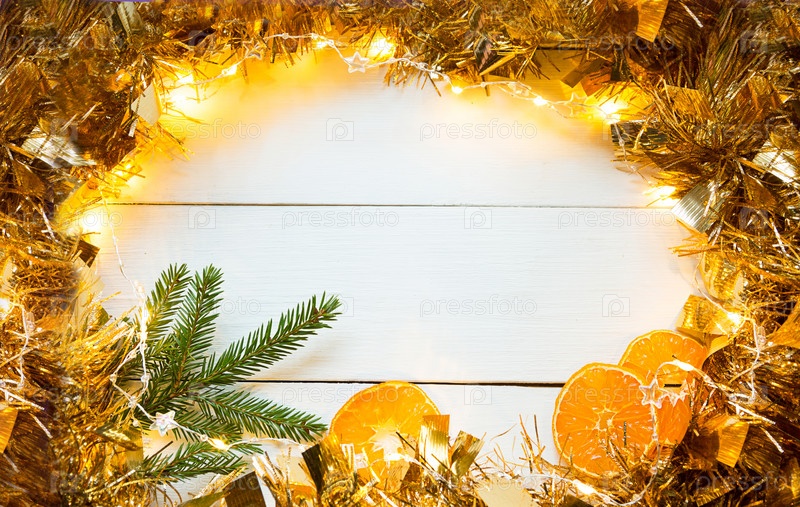 Дольки сушеных апельсинов, палочки корицы, еловые ветки. мишура и золотая гирлянда на белом фоне деревянные. Рождество, новый год, праздник, теплая осенне-зимняя атмосфера. Копирование пространства, плоская планировка