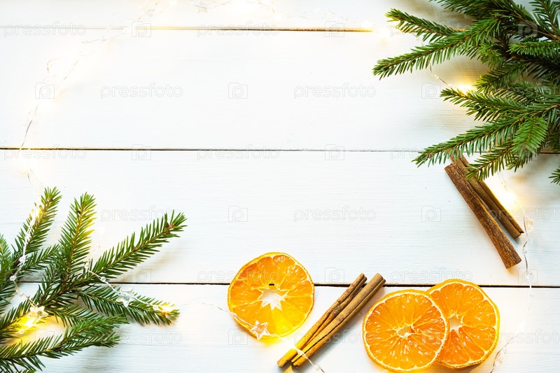 Дольки сушеных апельсинов, палочки корицы, еловые ветки. мишура и золотая гирлянда на белом фоне деревянные. Рождество, новый год, праздник, теплая осенне-зимняя атмосфера. Копирование пространства, плоская планировка