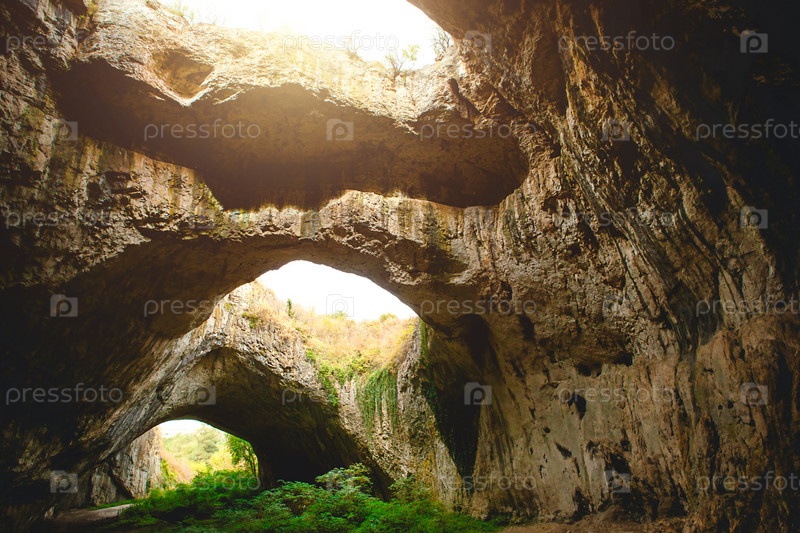 Пещера Деветашка в Болгарии - природная достопримечательность. Высокие своды огромной каменной пещеры с круглыми отверстиями наверху, туристическая дорога с забором внутри пещеры